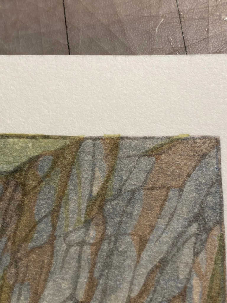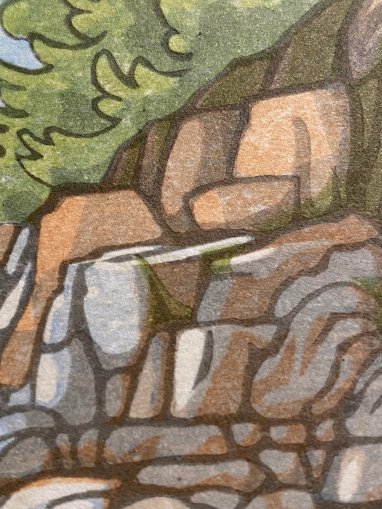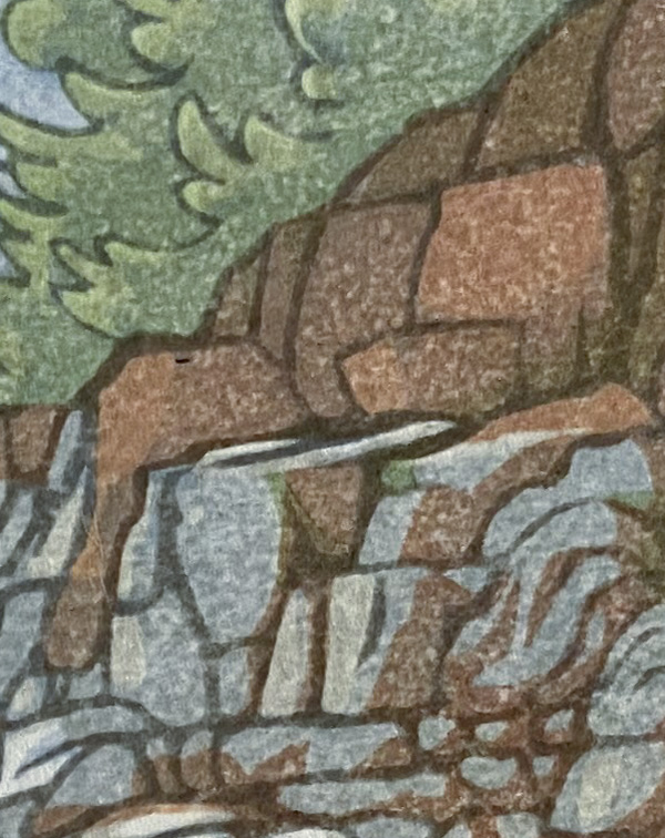 Looking back at my test prints, I see there are some registration problems with the green block. In the left image, there is green that sticks up too far, onto the top of a rock that should be mostly white. And on the right, there are some areas of green that extend past the border.