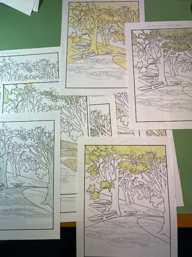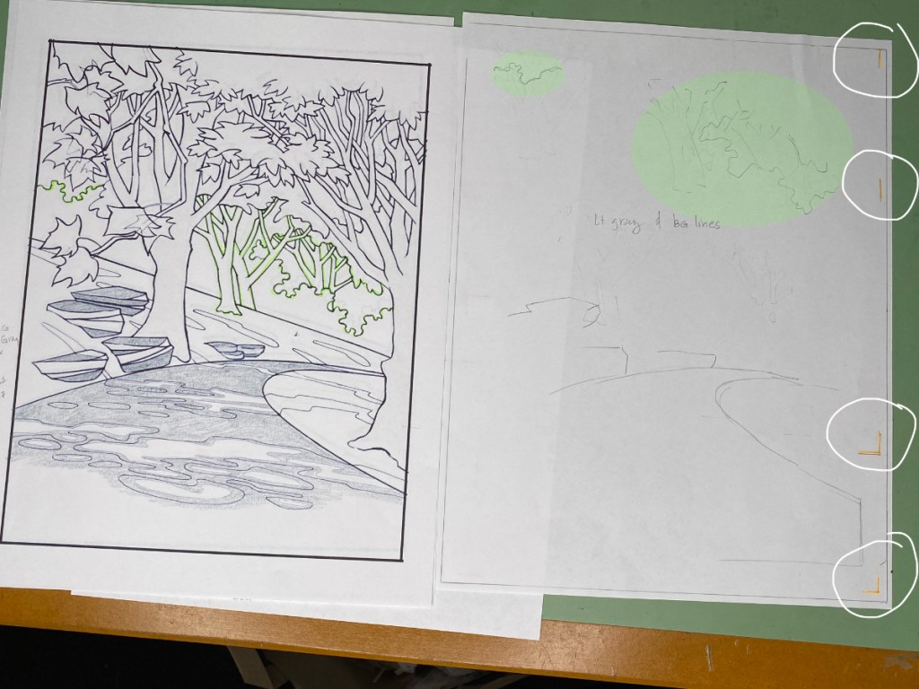 From when I initially made that table, I changed plans about the outlines of the trees in the distance. Not only the farthest trees, but the two at mid-distance, need to have lighter outlines than the main key lines of the image. On the right-hand image above, the pencil sketch on the right shows that I can put both the light gray of the roadway and rocks, and the key lines of the mid-distance and distance trees on the same block, if I use different sets of registration marks. On the “coloring book page”, the lines that are over-lined in green will go on the block where the light green blobs are on the right half of the shot; the gray of the road and rocks will go at the bottom. The white circles on the very right show the placement of the registration cuts – two corner cuts near the bottom, and straight cuts on the upper right.