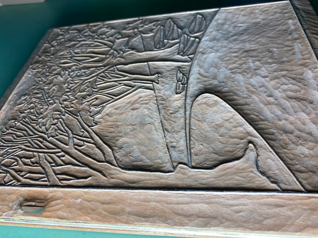 This block took some time to carve! Carving is not my full-time job, and indeed I don’t think I spent more than 3 or 4 hours a day working on this block (and usually only an hour or so). I started on January 2, and now am (mostly!) done 3 weeks later. I say “mostly” because test printing will no doubt reveal that some adjustments are in order! Either I forgot to clear a spot, or there is a splinter sticking up, or I need to deepen some of the valleys because they are shallow enough to to let the paper touch, which would risk getting pigment in unwanted areas.