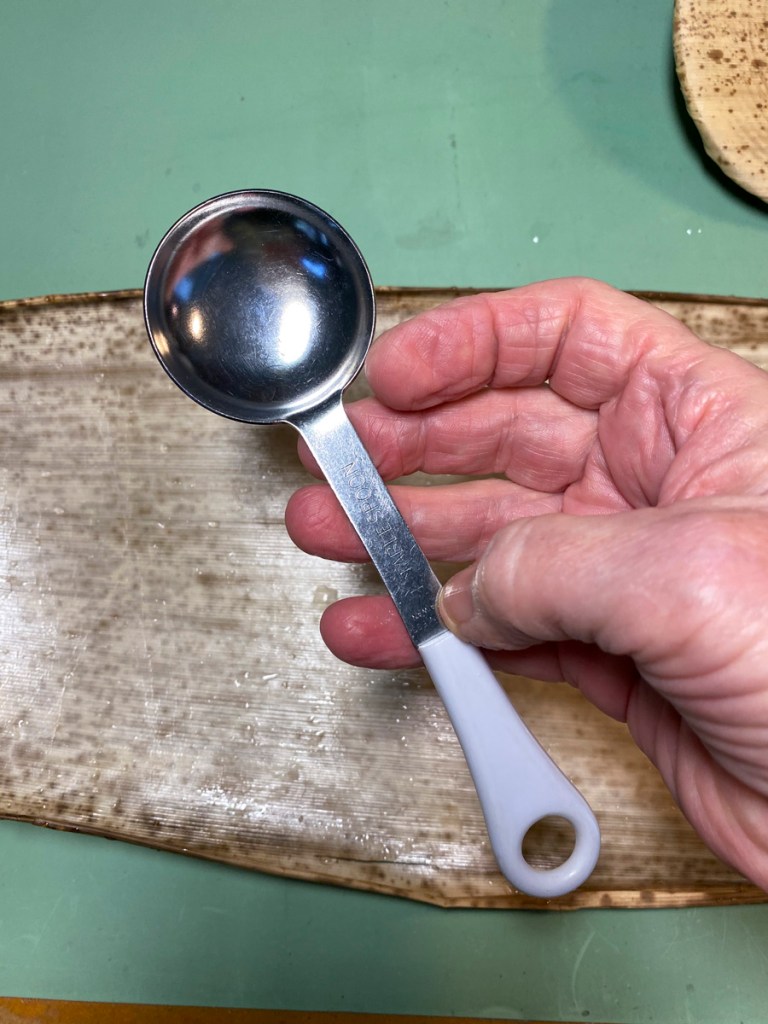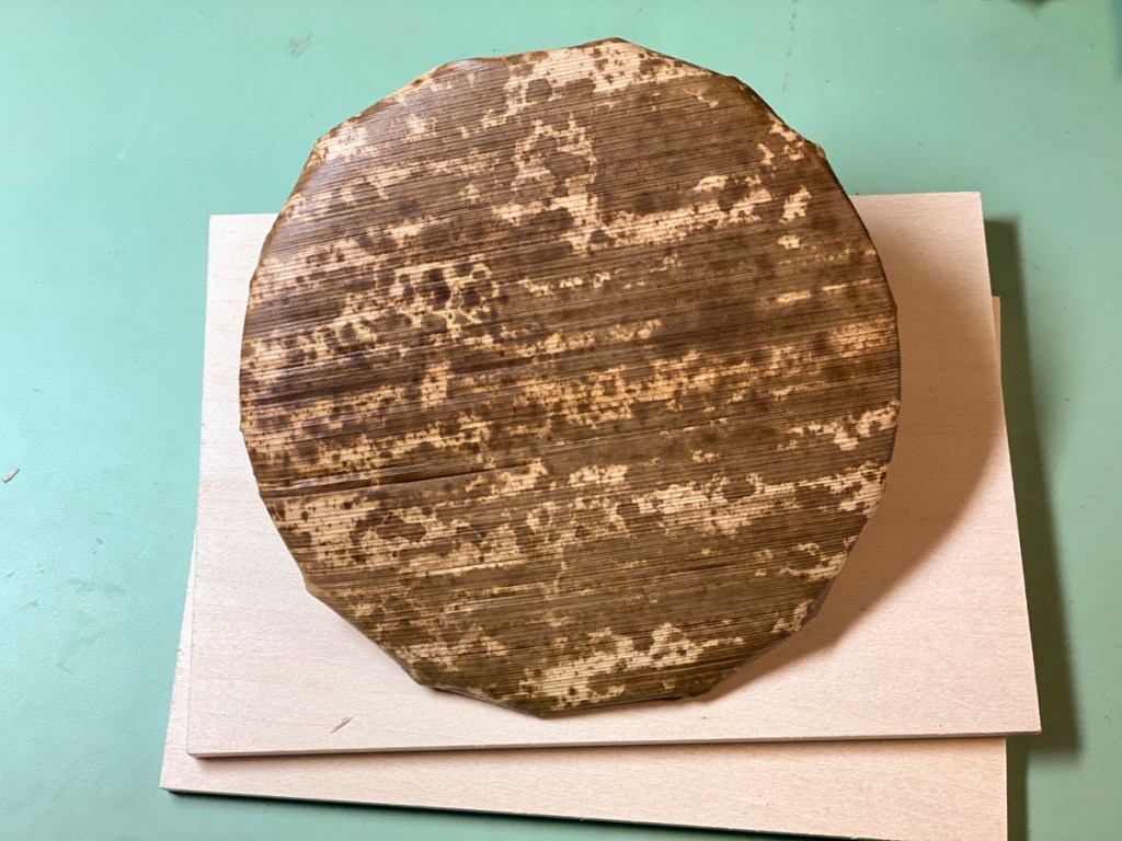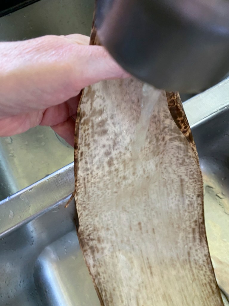 Traditionally, one would use a smooth black rock to rub the skin while supporting it on a plank of yamazakura wood. I thought a tablespoon would work pretty well! I rubbed at 90 degrees over most of the surface, on back and front, and periodically wiped parts of the skin with a wet paper towel when they were drying out.