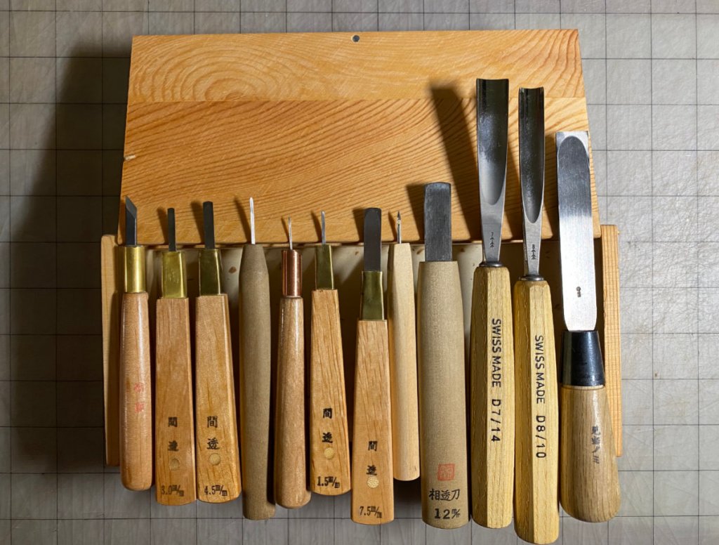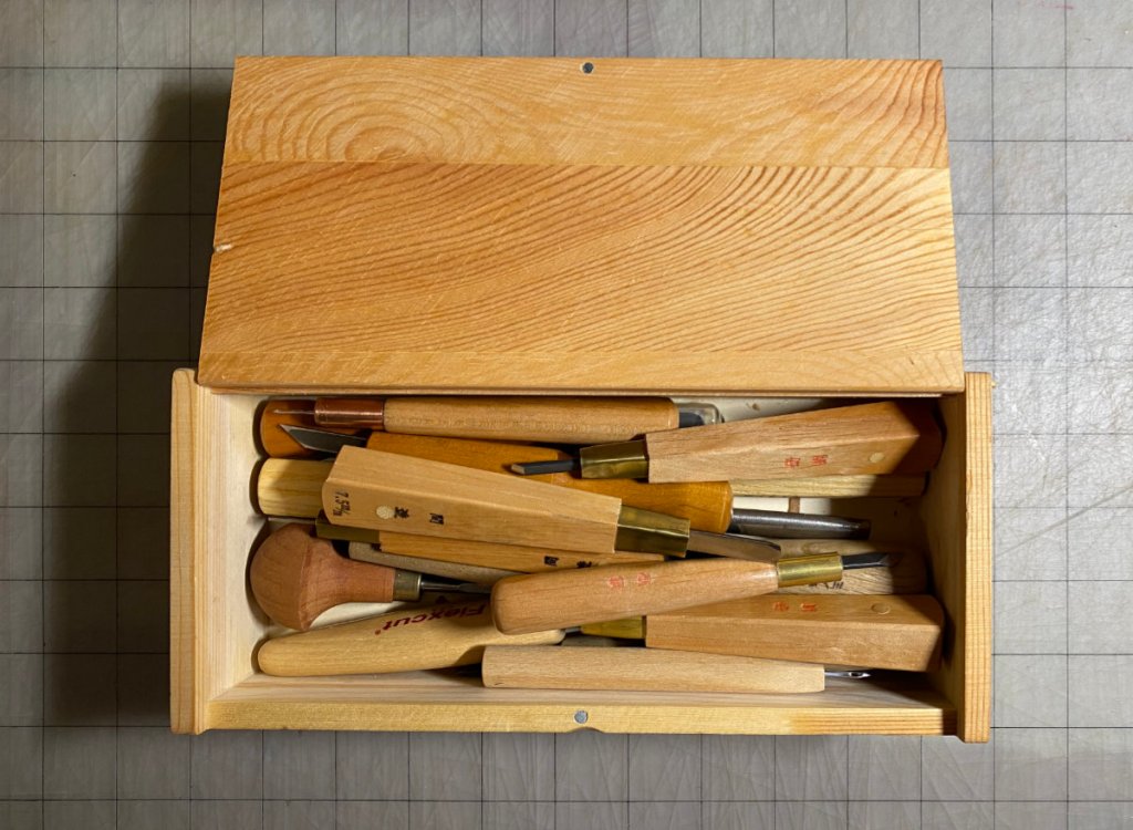 The other day on David Bull’s Twitch live-stream, Dave had a guest who is studying woodblock carving with Motoharu Asaka. The guest had brought his box of carving tools, a nice clear-ish plastic latching container. It was highly organized, with a little slot for every tool, arranged by type and size. Dave showed his, which was an open, beat-up cardboard box with tools jumbled inside, sufficient for keeping the tools from rolling off the carving desk.