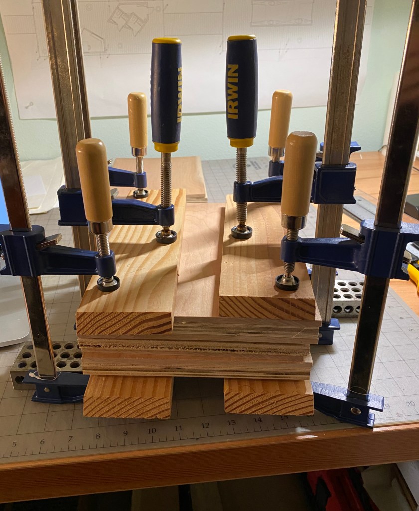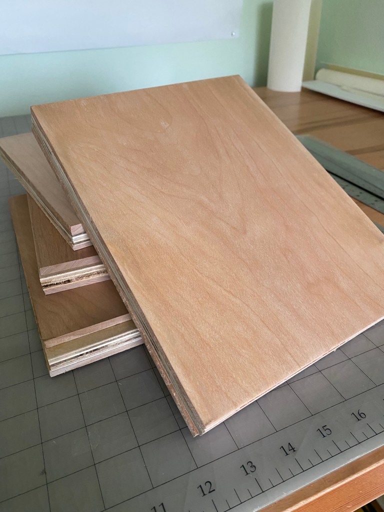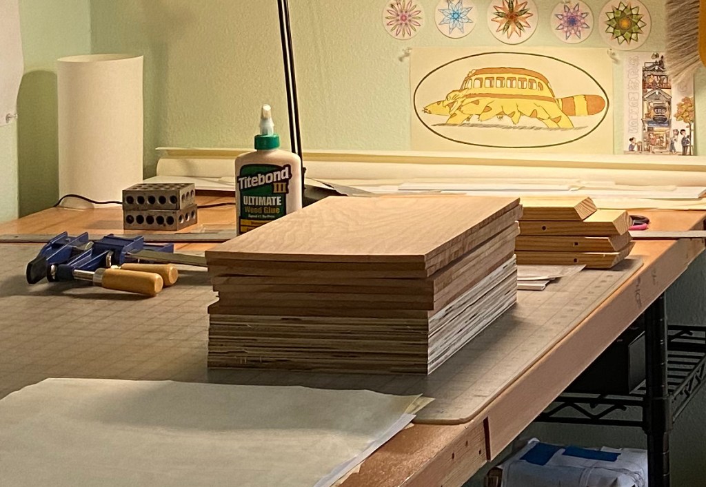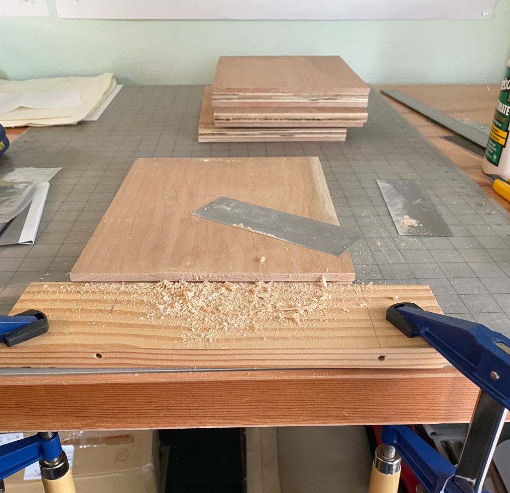 The video demo will start with making the blocks themselves from parts. This will be a pretty large print, the largest I have made using cherry blocks yet. The blocks are about 8″ x 10″. I used 1/4″ American Black Cherry thin lumber laminated to 1/2″ birch plywood with waterproof wood glue, then I used scrapers to get the surface of each block into shape.
