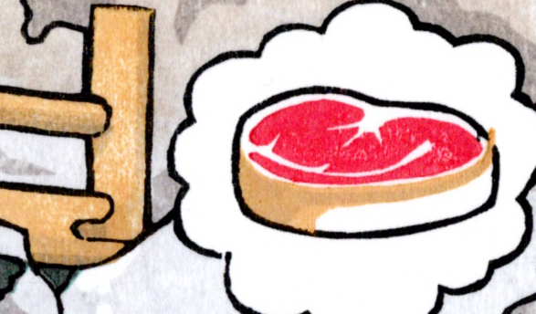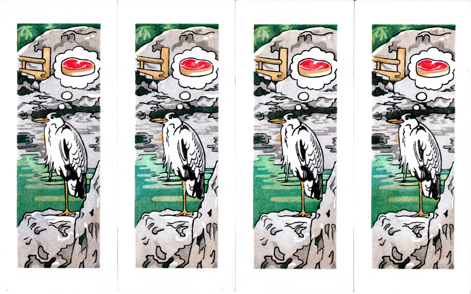 The left is on the handmade paper, and the right is on the machine-made. Both reveal a problem in my printing: I printed the key block last, and I used some pretty serious pressure in the earliest impressions — like the first one, in yellow. See how the yellow intrudes on the bottom line of the steak, and interrupts the upper right corner? This is not because there is a flaw in the key block — it’s because the paper is soft and squishy, and the yellow compressed it so much that the key block can’t get a complete impression! There are signs of this on the left, too, in the unevenness of the outline of the leg, and in the intrusion of the deep blue green into the mostly vertical outline of the rightmost stone. I almost want to blame the paper — I feel like strong pressure is needed to get a smooth, complete impression, so maybe a paper that is less yielding would give a better result.