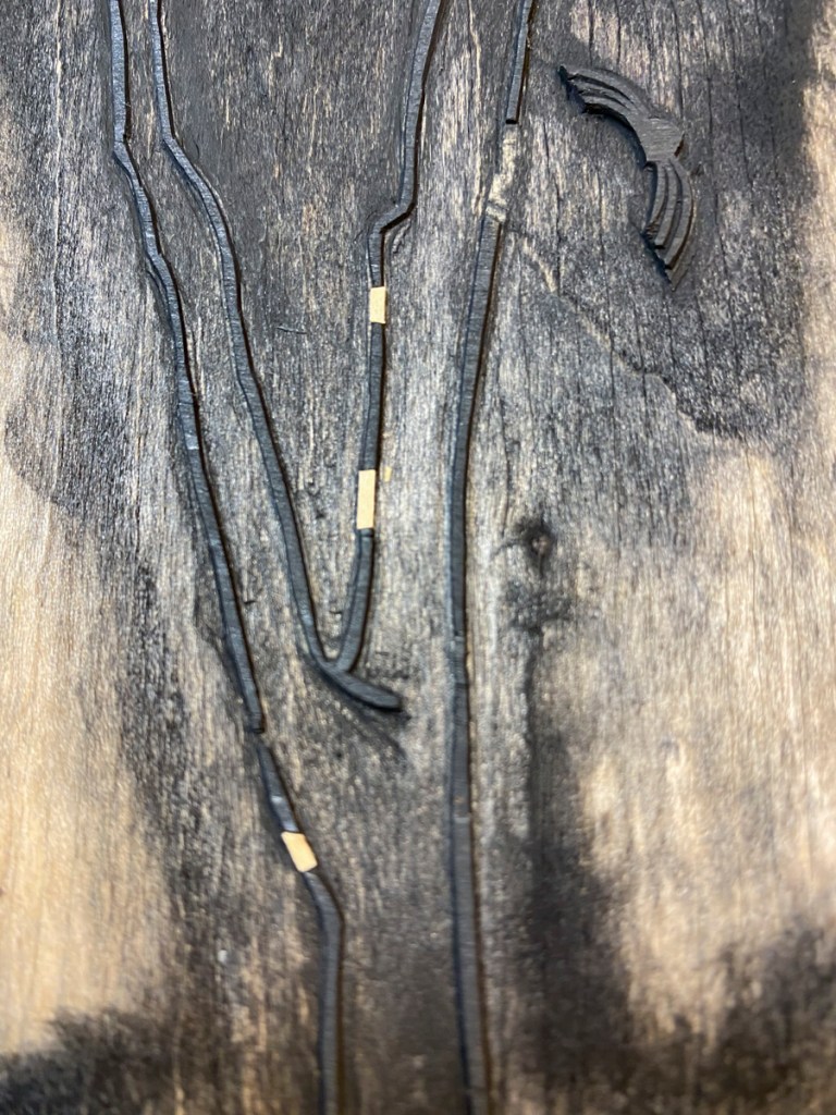 I had planned to print last night, applying maybe the last impression – the dark lines with sumi – on the fireflies, but when I looked at the block, I saw that some lines were missing. Blasted shina plywood again! You can see pretty clearly below that I filled in some places where the top ply went missing. Before printing, I’ll need to let the glue cure and then trim the patches to match the lines they are patching.