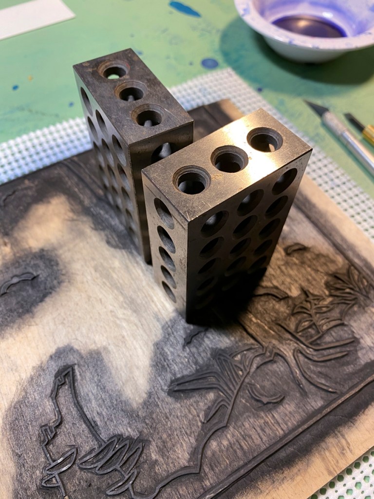 I’ve learned before that I need to let the glue cure really well before trying to use a block I’ve repaired this way. The next time I’ll have a chunk of time for printing is Thursday. There are 25 sheets in my stack – 19 of them on the Echizen Kozo – and it has been taking me about 3 hours to get through the stack, clean up my tools, and get the paper packed for the freezer, and I have that kind of time only 4 days a week.