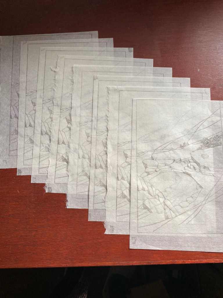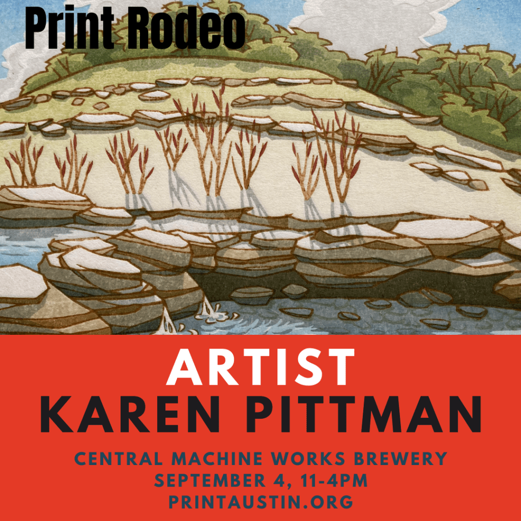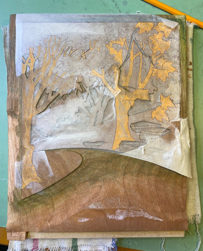 Here’s Katherine’s original watercolor sketch, probably on cold-pressed Arches (her fave) – just an unsigned sketch, not a finished painting. She did produce a finished piece, and if I can get a good photo I may post it later. It’s been hard for me to build up the saturated color in a block print that one can get from strong pigment and brush; something to work on. And you can see I paid a lot of attention to the rocks in my version! I LOVE rocks 😉